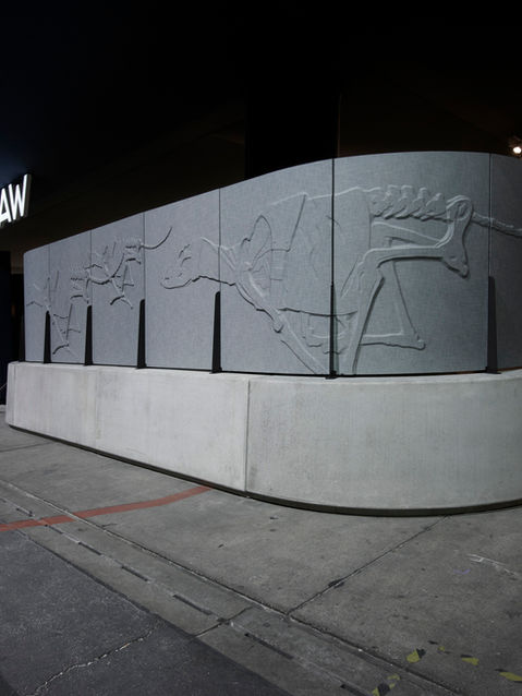 Facade with choreographed robotic arms showcasing curated pieces. Part of an entire trade fair design